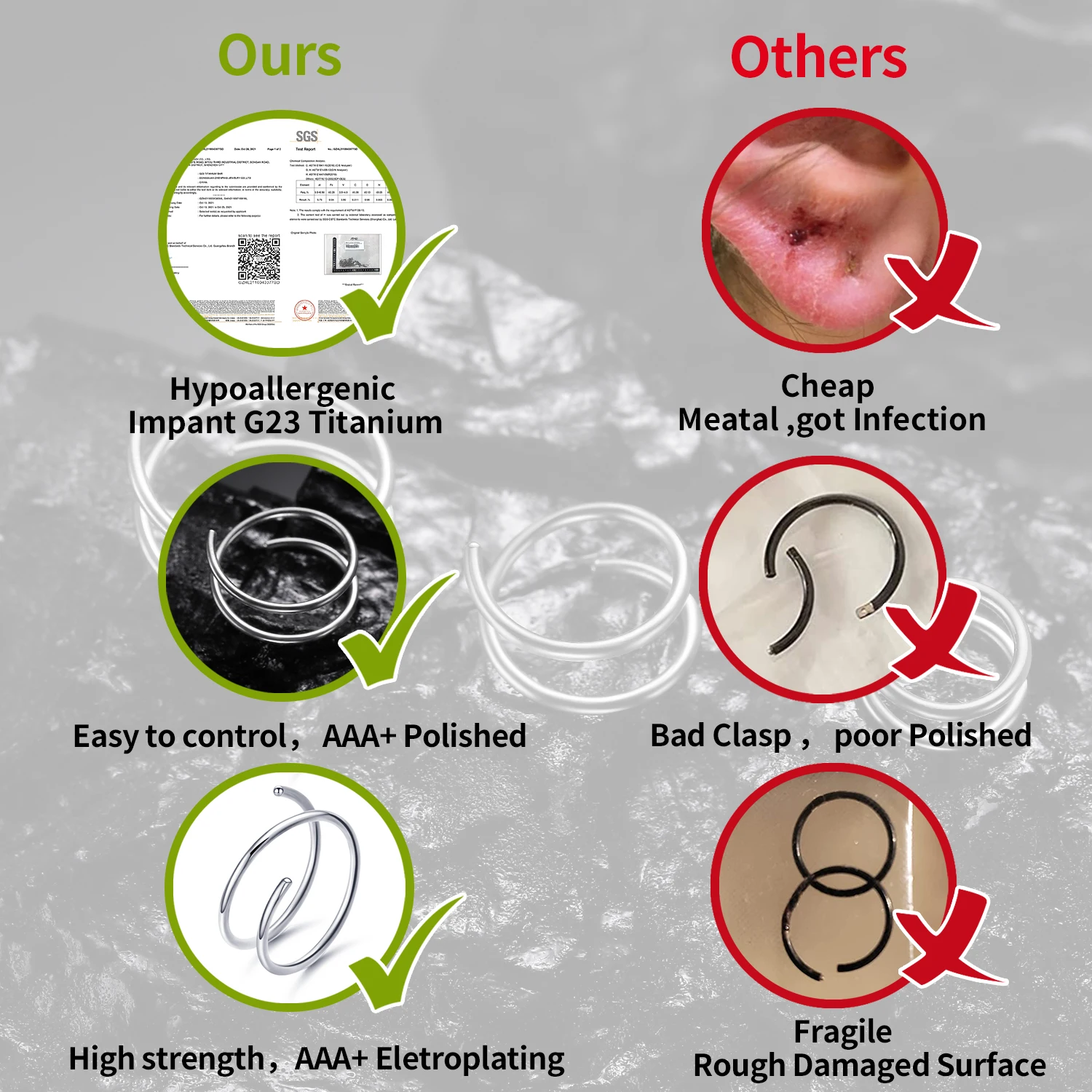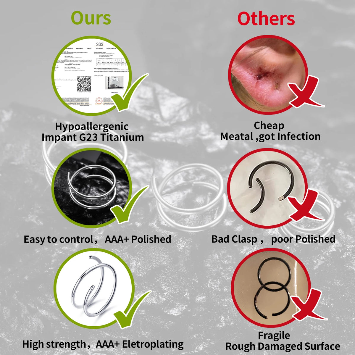 ★ Hypoallergenic and Nickel-free ★: implant grade G23 titanium with SGS certification.